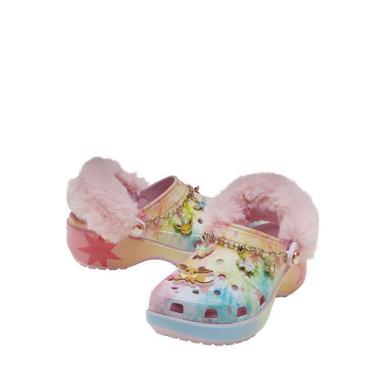 Get ready to transform your footwear. Because we’ve evolved the Classic Platform Clog with Eevee-inspired details, like a fur backstrap, dusting of glitter and a metal chain with enamel charms.