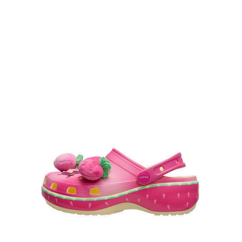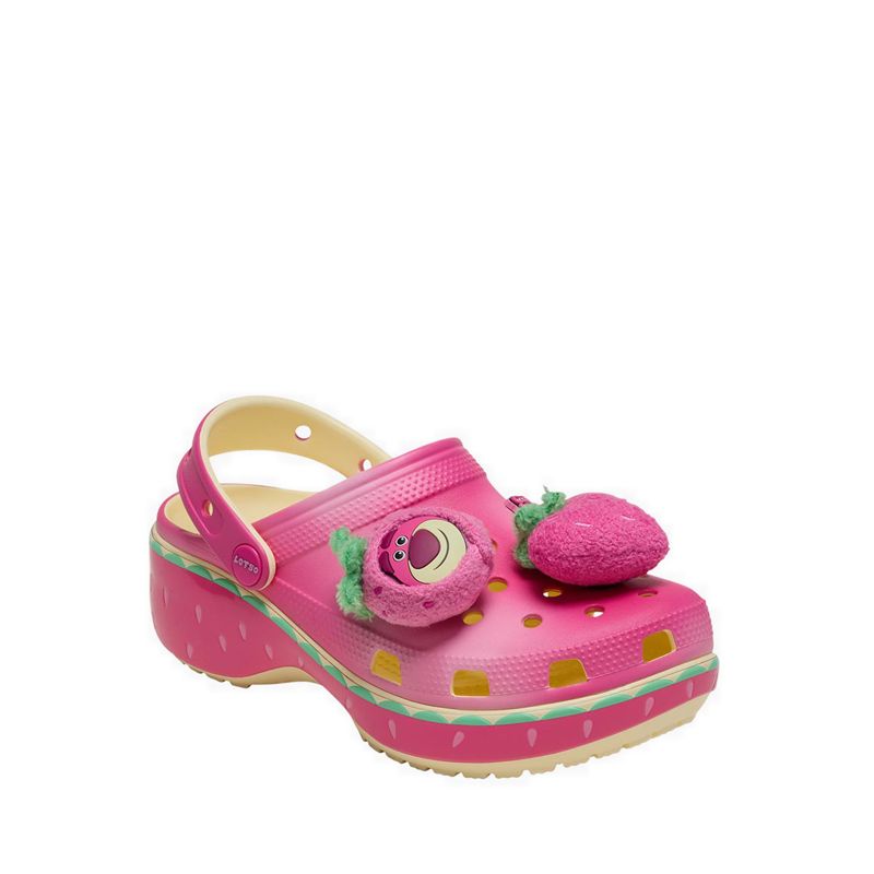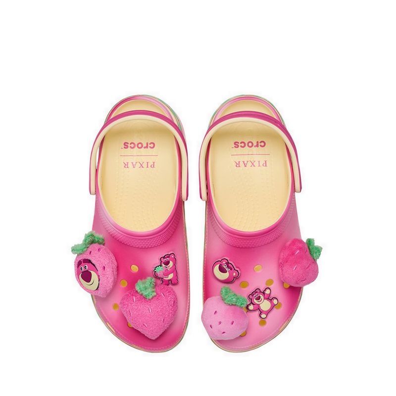 You’ll love the new Toy Story Lotso Classic Platform Clog. This pair is all things cute, elevated, and even scented like strawberries just like Lotso. The wavy pink upper and heel strap hold a plush collection of oversized strawberry Jibbitz™ charms, two-character charms, and more room for your own personalization. A rubberized outsole features a strawberry motif that wraps around the shoe for a beary sweet look and feel.